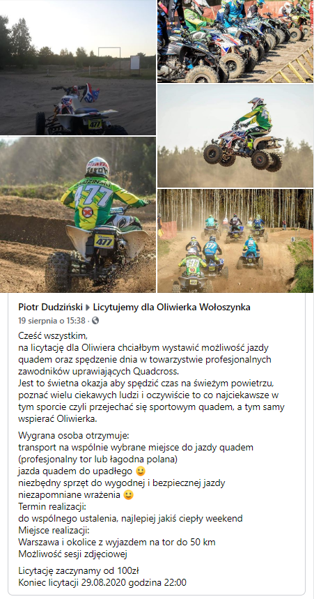 Licytacja charytatywna 22 sierpnia 2020Kategorie FacebookZamieść komentarz we wpisie Licytacja charytatywna Kochani! Zachęcamy do wzięcia udziału w licytacji! Cel jest Wielki, a przy okazji można sprawić sobie lub komuś ogromną przyjemność! Link do licytacji